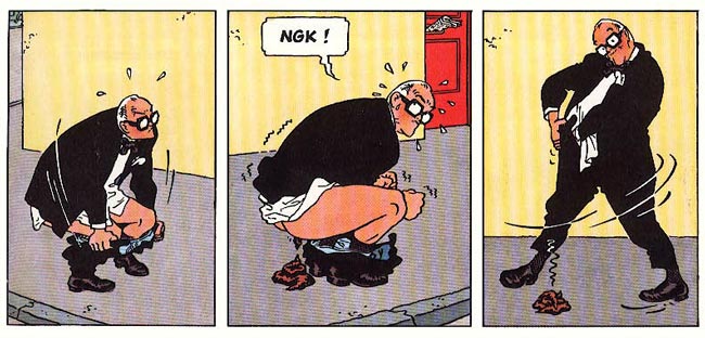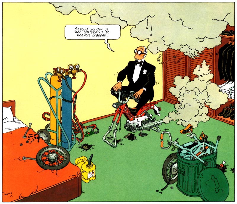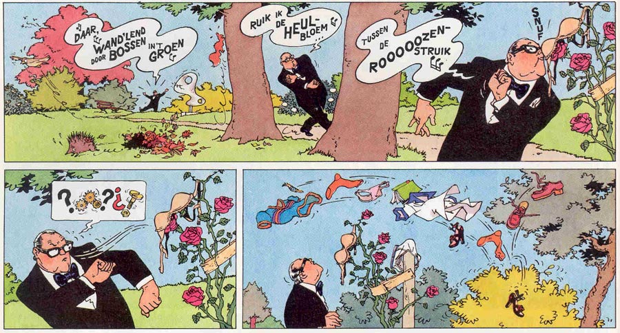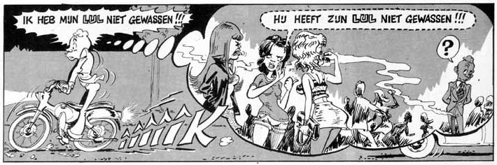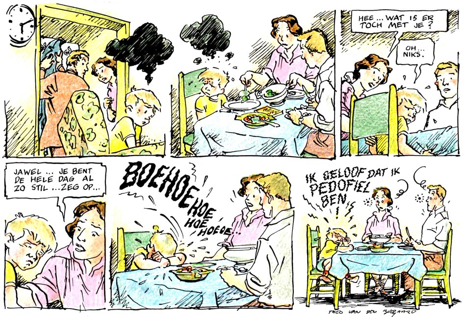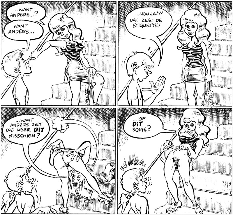 Yet the authors are equally vicious towards the tolerant people who claim "everything should be allowed." Van Oekel repeatedly stumbles upon religious fanatics, prostitutes, exhibitionists and lewd perverts. In his naïvité, he sees nothing out-of-the-ordinary about their behavior. Many of these scenes are quite risqué and would nowadays have more trouble appearing in print than back then. In one story, for instance, Van Oekel enters a store where a creepy man tries to make a child pornography video with a kid preparing to undress in a changing room. Both the boy and Van Oekel are completely oblivious about the man's actual intentions, although Van Oekel still thwarts his plans by sending the boy home.
