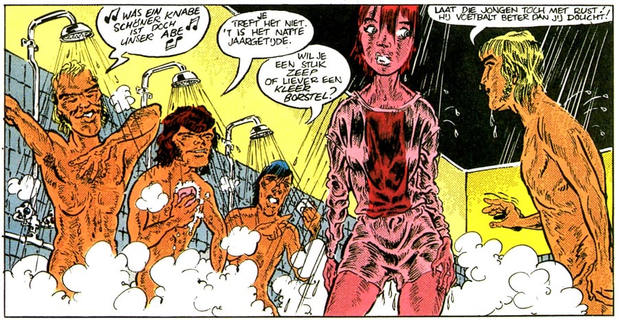 Another recurring feature by Theo van den Boogaard was printed in Voetbal International magazine, 'Abe, Een Hotshot Van Een Voetballerina' (1972). Written by sport journalist Nico Scheepmaker, the comic revolves around Abigail, a Frisian girl from the village of Pingjum. She turns out to be a goal wonder and signs a contract with association football club Ajax. Because of her short-cut hair, everyone mistakes her for a man. Satirizing the taboo of homosexuality in the world of sports, the authors have several players feel attracted to Abigail and assume they are gay. 'Abe, Een Hotshot Van Een Voetballerina' is loaded with references to sports events and celebrities, making it both a time capsule of 1970s sports culture and a somewhat incomprehensible reading experience for modern-day audiences. In 1973, De Bezige Bij collected the comic in a book.