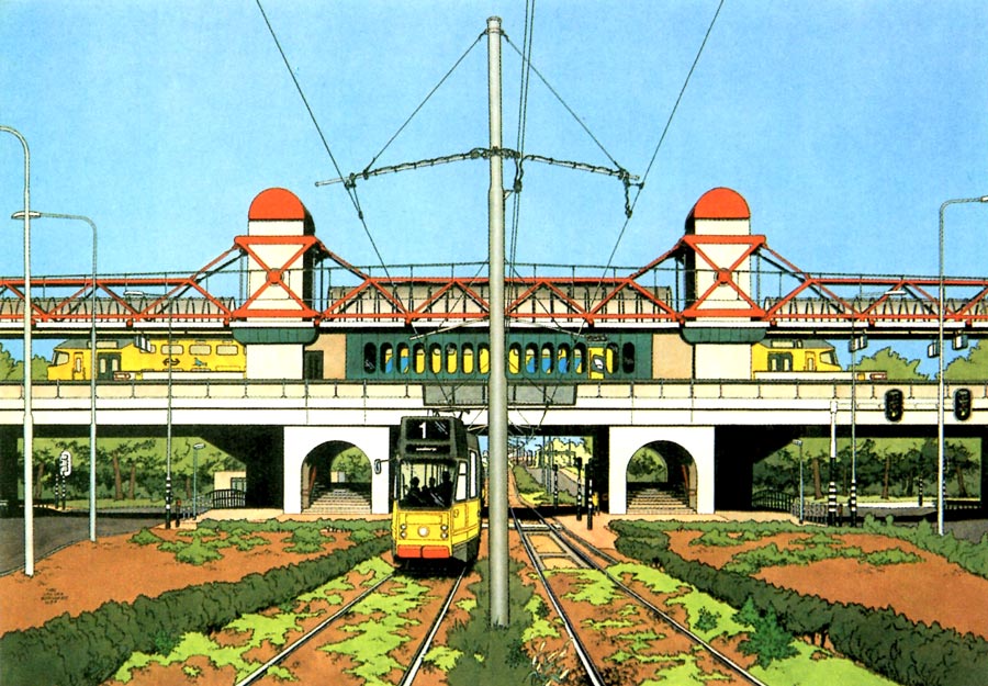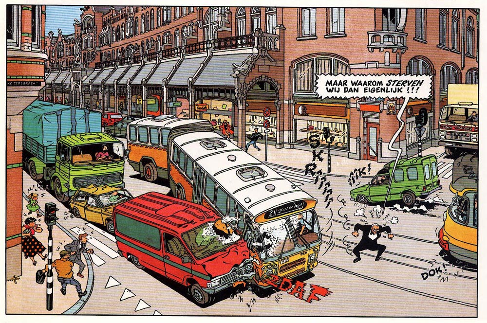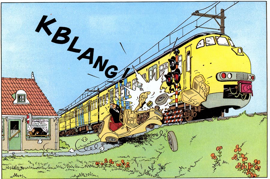 A major difference between the 1976 version of 'Sjef van Oekel' and the 1980 reboot was the graphic style. Van den Boogaard felt something was off about his earlier version. Interviewed by Michael Minneboo in 2010, he reflected that the gags would work better if they were portrayed in a realistic and recognizable environment. In the TV shows, a large part of the comedy arose from the fact that Sjef van Oekel's variety show looked like a regular program, making all the outrageous things that happened far loonier and surreal within their seemingly "normal" setting. For the comic, Van den Boogaard therefore switched to a more detailed, realistic graphic look, inspired by the "Clear Line" of Hergé, which at the time experienced a renaissance through artists like Joost Swarte and Ever Meulen. In 'Sjef van Oekel', the clean, crisp backgrounds provide an odd contrast with Van Oekel's off-the-wall behavior and the outrageous controversial comedy. Many episodes are set in Amsterdam, with numerous recognizable streets and buildings. Huge panorama shots contain many details and little background jokes. Since Van den Boogaard was fond of trains, Van Oekel is often seen in railway stations or near tracks. The drawings provide a beautiful time capsule of the Dutch capital in the 1980s and early 1990s, down to people's fashions. However, Van den Boogaard didn't mind that some of his artwork eventually became a bit dated. He compared it with Laurel & Hardy, whose movies are clearly set in the 1930s, but remain timeless entertainment. To render all these stunning, but time-consuming backgrounds, he hired assistants like Paul Schindeler, Eric van Rootselaar, Hilbert Bolland and Michel Custers to help him, while former Hergé assistant France Ferrari took care of the coloring.