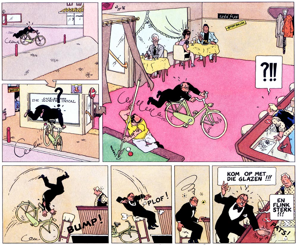 Between 1976 and 1977, the 'Sjef van Oekel in de Bocht' comic was serialized in the magazine Nieuwe Revu. In this early incarnation, Van den Boogaard still used a cartoony graphic style. Just like his TV counterpart, the cartoon version of Sjef van Oekel was a clueless and otherworldly simpleton. His formal attire and stuffy attitude were inspired by Van den Boogaard's own father. After 25 episodes, the artist already discontinued the feature, since he had underestimated how labor-intensive the production of a weekly comic can be.
