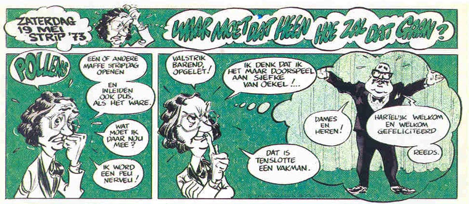 Like many people of his generation, Van den Boogaard loved these taboo-breaking shows. When VPRO television hired the artist to design some promotional stickers, he also asked the corporation if he could create a celebrity comic based on Sjef van Oekel. After all, the TV character was very expressive, with a distinctive appearance, making him suitable for a humorous comic. To give them an example, he depicted Sjef van Oekel and Barend Servet in a promotional gag page printed in a 1973 issue of comic news magazine Stripschrift. On this page, the characters informed the readers about an upcoming comics-related event. Van den Boogaard also used the Van Oekel character to promote the album release of his comic series 'Abe, Een Hotshot van een Voetballerina'. Eventually, the VPRO gave Van den Boogaard permission, with TV series creator Wim T. Schippers coming on board to script the gags. In terms of graphics, Van den Boogaard was given complete creative freedom, but Schippers stipulated that all dialogue had to be kept as written.