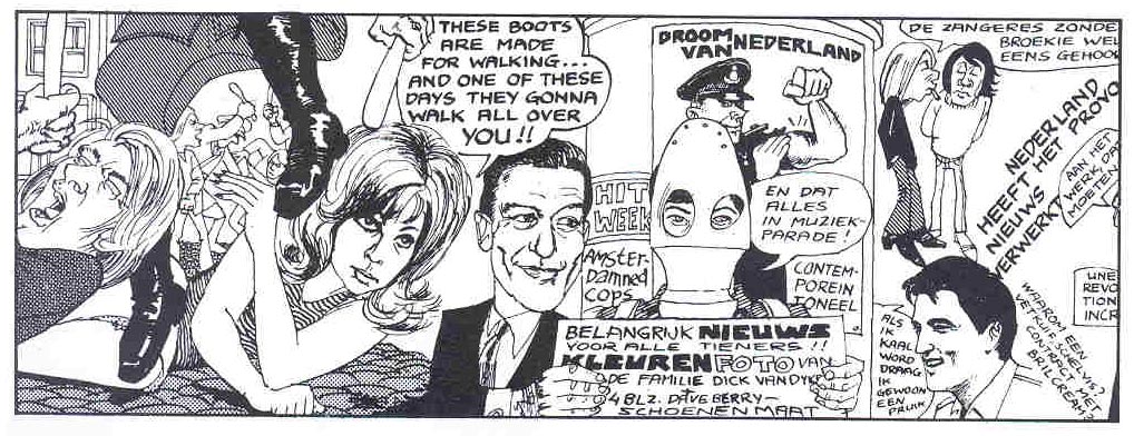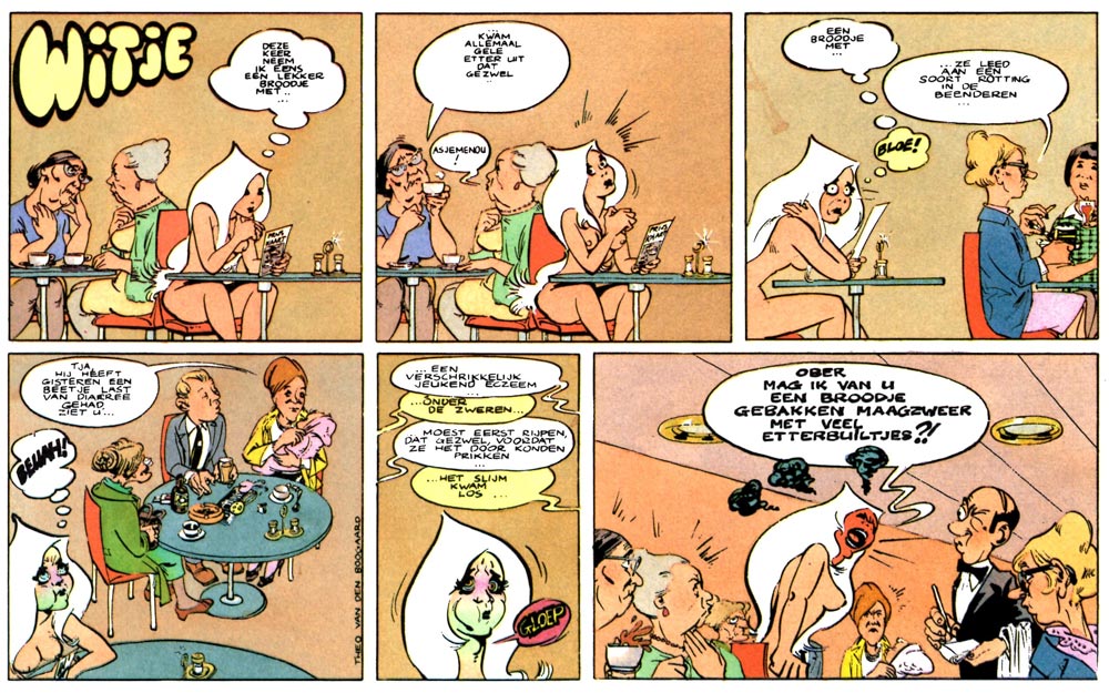 When Van den Boogaard was still a 17-year old high school student, his work was published in the Dutch underground and pop music magazine Hitweek. Immediately after graduation, the artist left his hometown and settled in the more free-spirited city of Amsterdam. One of his columns in Hitweek was the 'Striptease' series, in which he visualized song lyrics and provided them with social commentary. His posters of rock legends like Jimi Hendrix and Bob Dylan became equally popular. Together with editor Jan Donkers, Van den Boogaard created Hitweek's comic feature 'Witje' (also known as 'Witje en Gert', 1968-1969). It stars an attractive white-haired woman who always walks around in the nude. However, no one around her seems to notice this, not even her (dressed and more straightforward) boyfriend Gert. When Hitweek changed its name into Aloha in 1969, 'Witje en Gert' continued in its pages for a while. In 1973, when Tango released a first landscape-format book collection of 'Witje', Van den Boogaard drew some extra episodes. The 'Witje en Gert' strip is historically important as the first Dutch underground comic.