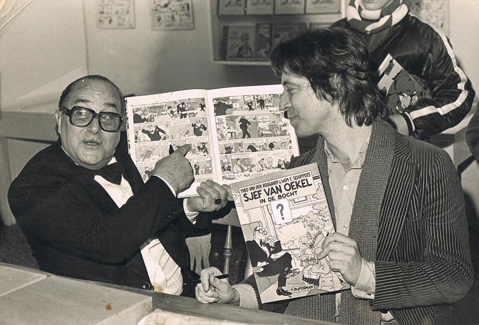 Dolf Brouwers and Theo van den Boogaard signing 'Sjef van Oekel' books in Kees Kousemaker's comics shop Lambiek (27 December 1980).