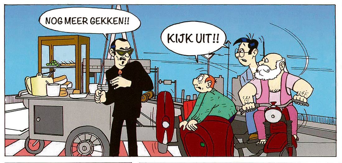 Jan Booister had a long career as a journalist for Het Vrije Volk and Rotterdams Dagblad. When he retired, he decided to fulfill a childhood dream and create his own comic album! Booister had previous scriptwriting experience with 'Coentje', the mascot of the Rotterdam football club Feyenoord, which was created by Martin Lodewijk, drawn by Minck Oosterveer and published in Algemeen Dagblad and De Kameraadjes. But drawing, coloring and publishing his own comic was a whole different ball game. The new comic artist studied the work of Dutch masters like Dick Matena, Fred Julsing and Martin Lodewijk, and got technical tips from Lodewijk and Robert van der Kroft. His experiences in his new trade were chronicled in a series of columns in the comics news magazine Stripschrift in 2016-2017. The book 'Jeutje, Torpedo's' was self-published in 2016, and starred the characters Joep and Jeff, two children who were named after the author's grandson and his nephew. The fact that the comic was set in the Dutch cities Rotterdam and Maassluis gave him local press attention, and sales from local bookshops. Celebrities like Jules Deelder, Herman den Blijker and Johan Derksen have guest appearances in the strip. Having made his debut as comic author at the age of 68, Booister enthusiastically started working on a second book starring the crime-fighting children. 'O.M.D.D.I.H.T.V.' was self-published in 2017, and also featured appearances of several local hotspots and celebrities.