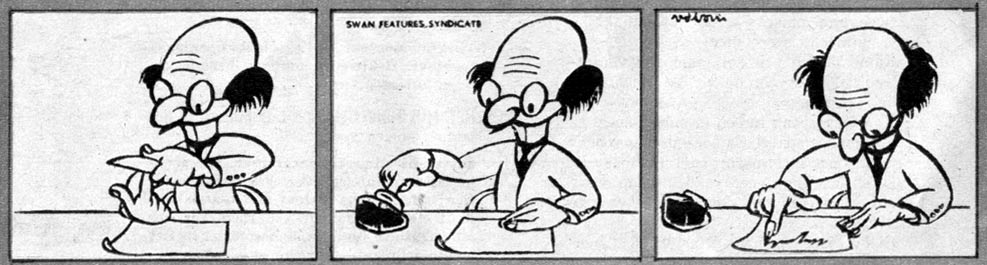Originally, his home newspaper showed no interest in 'Professor Pi', so Van den Born offered it to the British magazine Time & Tide instead. Only when it became a success there and found a spot in a Spanish and Chinese magazine as well. 'Professor Pi' finally got greenlighted by Het Parool. It debuted on 2 January 1955 and first ran in their weekend supplement, as a series of independent cartoons. Popular demand, including some urging of photo editor Theo Ramaker, eventually made it a daily fixture, which ran in Het Parool for almost a decade. An announcement of the daily strip appeared in the paper in late 1956, and the feature ran from 2 January 1957 until 9 December 1965. Between 1993 and 1998, episodes were reprinted in Het Parool. Thanks to its lack of dialogue, 'Professor Pi' was easily translatable and thus ran with equal popularity in France, Spain, China, Italy, Switzerland, and North and South America through the Swan Features Syndicate.