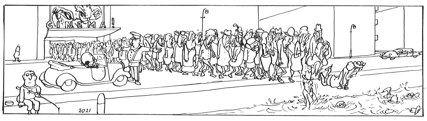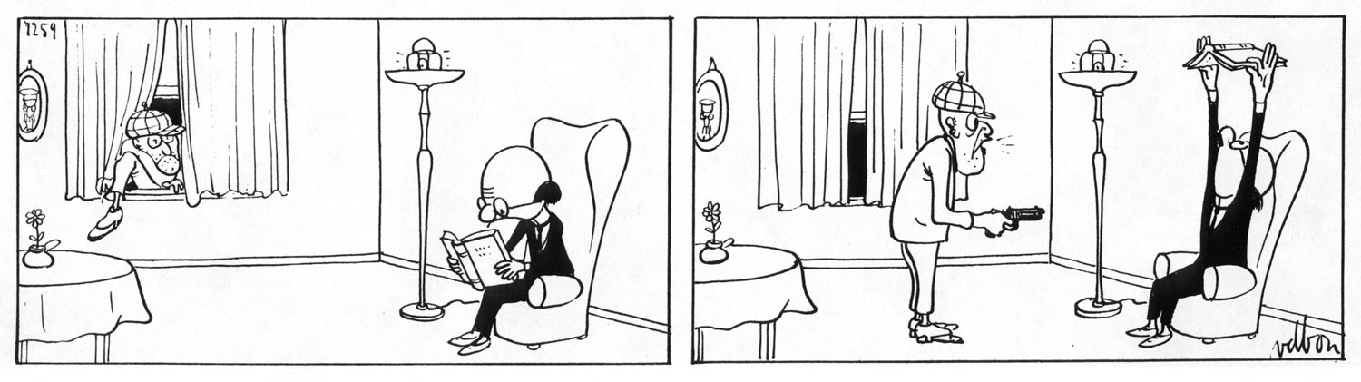 In 1954, Van den Born created the absent-minded and egg-headed 'Professor Pi', who always remains calm and imperturbable in every situation. Many gags poke fun at the professor's daft behavior. But likewise, many people around him act just as strange. Over the years, the titular professor grew into an ardent observer of a world increasingly absurder than himself. Van den Born took delight in thinking up visual jokes that aren't always obvious at first sight. Many panels with crowds are full with people and animals who act bizarre. It's not always clear whether they are part of the main gag or just extra background gags. It gave 'Professor Pi' its own eccentric flavor, which helped it stand out among newspaper gag comics at the time. The comic also attracted fans among intellectuals, since the clever jokes require more meticulous observation to spot every funny detail. While 'Professor Pi' started out as a comic, it nevertheless evolved more into a one-panel cartoon over the years.