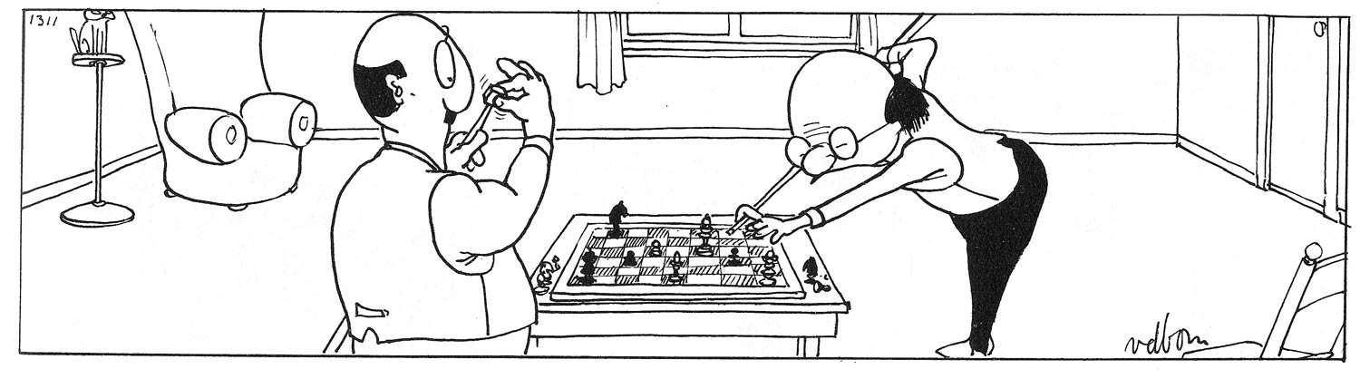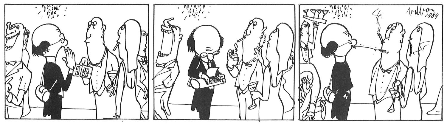 Yet, curious bystanders often looked over his shoulder, while he tried to concentrate on his drawings. This irritated him, not to mention the large crowds at all these public events. It convinced him to change his profession and become a cartoonist instead. While some of his drawings were published in Het Parool and the news magazine Mandril, many other cartoons were rejected. Interviewed by Peter van Brummelen for Het Parool (8 March 1991), Van den Born remembered that each time he brought 10 cartoons with him, only one might get published. In order to make a living, he decided to become a newspaper comic artist.