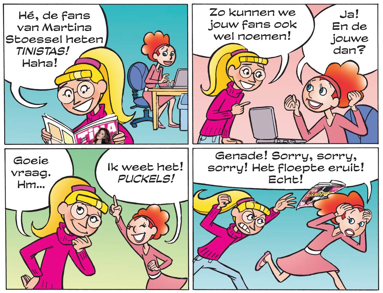 Editorial strip from Tina #8, 2016. Translation: Puck:"Hey, the fans of Martina Stoessel are named 'Tinistas', haha!" - "We can give your fans the same name." - Tina: "Yes! And yours?" - Puck: "Good question, hm..." - Tina: "I know: 'Puckels!' ('pukkels' is Dutch for 'zits'). "Have mercy! Sorry, sorry, sorry! I simply blurted it out! Really!".