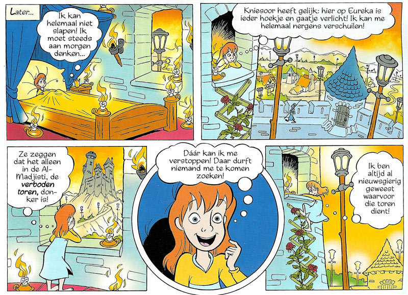 Wilma van den Bosch is also the author of her own comic series 'Prinses Aster' (1999-2001). Aster is the princess of the small and isolated planet Eureka. Because her father, king Zolaf Leeuwenmoed, is afraid of the dark, the planet is always covered in light. Therefore the people of Eureka are not aware of the rest of the universe. Aster wants to know more and goes on a space trip with the help of astrologist Zenitnadir. Her quest to catch a star brings her to other planets, where she encounters colorful characters, including a gang of space pirates. Van den Bosch started working on the comic when her daughter was born. It took her and her partner and colorist Pascal Oost seven years to complete the project. Two long stories with the character were published in Donald Duck in 1999 and 2001, and then collected in book format by Sanoma and Silvester. The scripts for a third and fourth story have been written, but have remained unfinished.