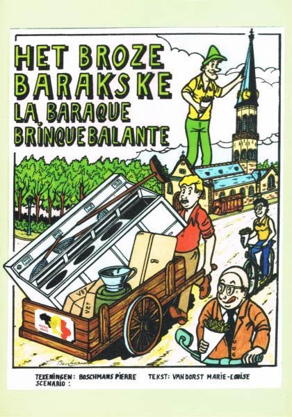 For many years, Pierre and his wife Marie-Louise van der Dorst ran the fries stand Bieke in Schelle, where they sold Belgium's most famous export product, fries. On the side, he made the annual New Year's cards for Navefri, the National Union of Fry Fryers in Belgium. The chairman of the union approached him to create a comic homage to the Belgian fries culture and its typical stalls. This resulted in the comic book 'Het Broze Barakske' ('La Baraque Brinque Balante', 2008), distributed in a print run of 10,000 copies to fries stands around the country. The book was an instant hit, and the artist even received compliments from King Albert II, Crown Prince (nowadays King) Philippe/Filip and politician Herman De Croo.