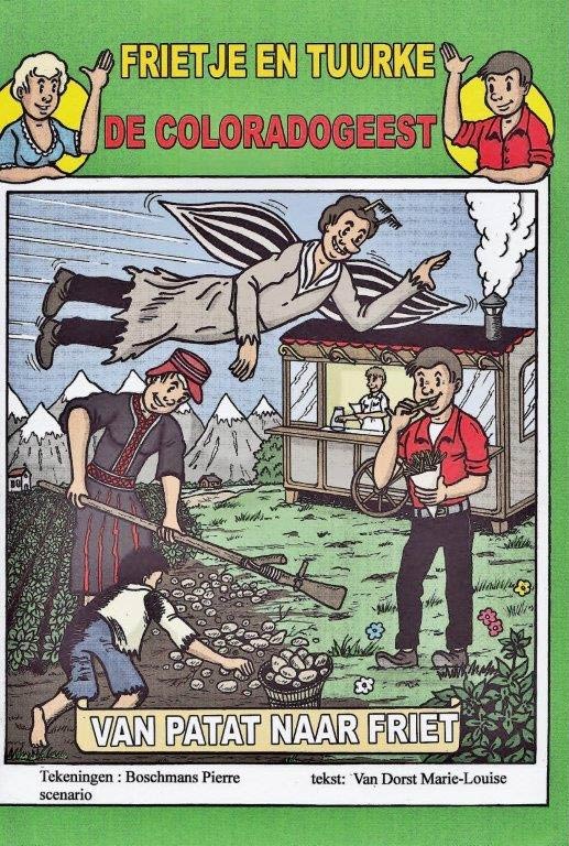 When health reasons forced Boschmans to retire from the fries business, he picked up his drawing pen again for a new comic book, this time made by commission of the Fries Museum in Bruges. Starring the characters Frietje and Tuurke, the album 'De Coloradogeest - Van Patat naar Friet' (2017) chronicles the history of the potato in general and French fries in particular. Both his comic books were made in a steady collaboration with his wife, Marie-Louise van Dorst, who took care of the texts. The artwork shows a strong influence from Willy Vandersteen.