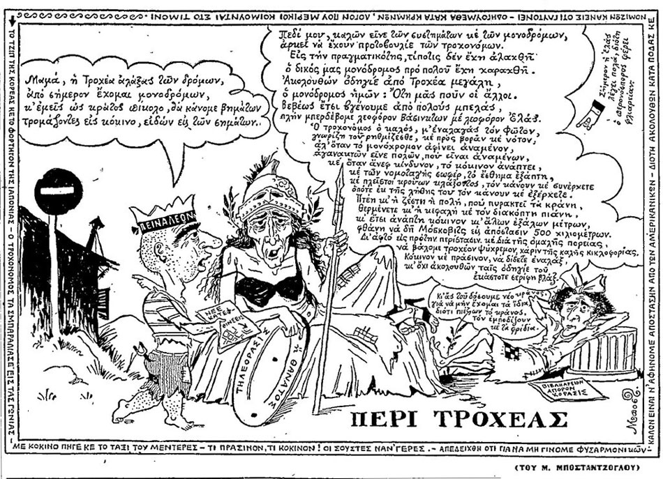 Bost cartoon from July 1960 about the implementation of one-way streets in Athens. Penaleon announces the news to Mama-Hellas, but she answers him wisely that the country's one-way street has long been made (referring to Greece's political-economic relationships with the Americans).