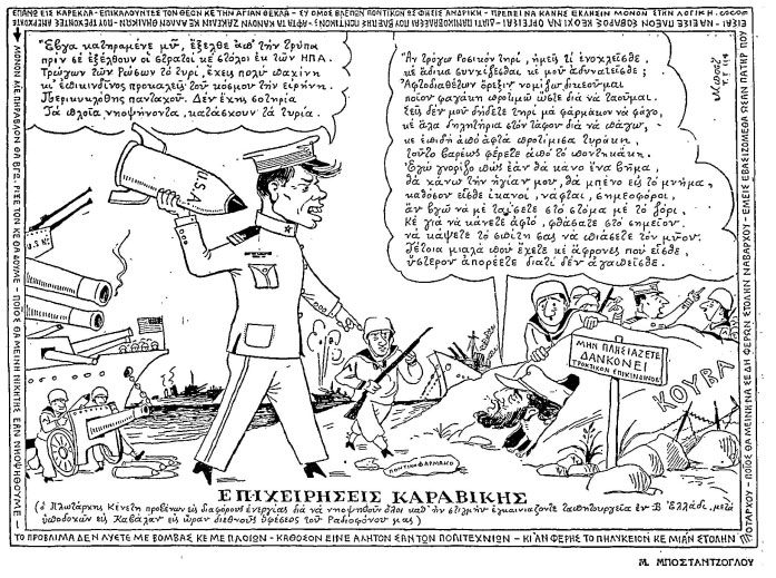 At Kathimerini, Bostantzoglou's talent was recognized too, resulting in the launch of his own column, 'To Bostáni tou Bost' ("The Garden of Bost", 1959-1961). It introduced Bost's best-known characters, the impoverished Mama-Hellas (Mother Greece) and her children Peinaleon (Hungry Man) and Anergitsa (Little Miss Unemployment), who commented on the news with misspelled words. Toying around with spelling, mispronunciation of words and mixed-up expressions became the main traits in Bost's commentary on the petty post-war bourgeois Greek, class struggle, xenomania and Greek politics. A leftist himself, he targeted the nationalism of the right-wing parties, but he also satirized the left-wing politicians. His work often got him in trouble. A piece called 'The Profession of my Mother' (1961) offended Kathimerini editor Helen Vlachos, and meant the end of Bost's association with the paper.