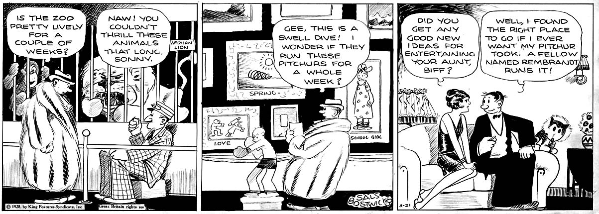 Salsbury Edgar Bostwick was born in 1902 in Eau Claire, Wisconsin, as the son of Mildred V. Salsbury and Sherman Edgar Bostwick, a commercial traveler. In 1919-1921, Bostwick published his first drawings and comics in his high school bi-annual magazine, the Kodak. He was a graduate of the Federal Schools correspondence course in cartooning, after which he contributed cartoons to the Saturday editions of his local newspaper, the Eau Claire Telegram. By 1922, he moved over to the Chicago Tribune, where he became the first(?) assistant of Frank King on his slice-of-life newspaper comic 'Gasoline Alley'.