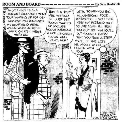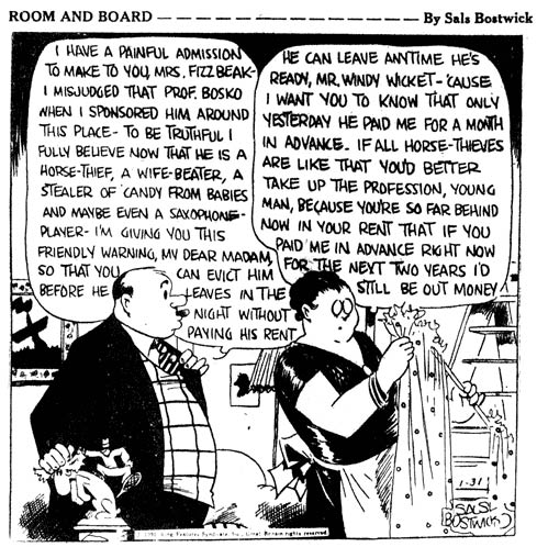 Bostwick's tenure with the Chicago Tribune came to an end, and he joined William Randolph Hearst's Chicago American and the King Features Syndicate. His first work for Hearst was the short-lived strip 'Main Street Jed' (1926), which was described as dealing with "the small town "sheik" - the "oft-crowned king of Birdville's drug store cowboys." He then continued with 'Hello Hattie' (4 April - 11 October 1927). On 21 May 1928, he created his single panel cartoon feature 'Room and Board' through a King Features subsidiary, the Central Press Association. It followed the lives of the colorful inhabitants of Windy Wicket's boarding house. Other features by Sals Bostwick were 'Floradora' and 'In Our Office'.