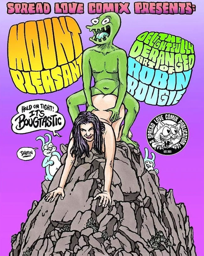 Between 2007 and 2015, Bougie edited and published eight annual issues of 'Sleazy Slice', an adult comics anthology marketing itself as devoted to "dirty comics". He contributed comics to Spread Love Comix, a comic anthology released in Montreal. Selections of his comics and pin-up art can be found in the self-published zines 'Mount Pleasant' and 'Scary Cherry'. Other comics by his hand have run in the Vancouver comic zine Drippy Gazette and also in Dexter Cockburn's 'Oh My! Comics' series. Together with fellow artist Hugo Schifoso, Robin Bougie provided the artwork for the biographical comic book 'My Secret Cockupation: Private Journals Of A Prostitute' (2009), scripted by Lil Princess (pseudonym of Meg McCarville). Published by Spread Love in Montreal, a later story collection by Robin Bougie was 'Cotton Candy' (2025), which contained new material and previously published anthology contributions.