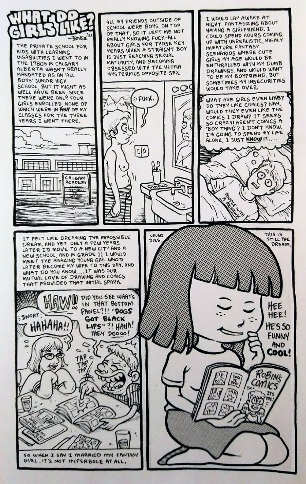 At age 19, Robin Bougie and his girlfriend (and future wife) Rebecca Dart lived on welfare, while teaching art classes for children. After watching Ron Mann's documentary 'Comic Book Confidential' (1988) in 1991, they decided to establish their own alternative comic imprint. The couple bought a shop in Saskatoon, Saskatchewan, named it Mind's Eye Artwear and made it a T-shirt and comic book store. They ran it for two years. A lack of money motivated them to not go to art school, but instead get their art education from library books and self-study. In the 1990s and 2000s, Robin Bougie earned a living through a variety of projects, including writing for the adult magazine Screw, reviewing porn movies for adult magazines like Fox and Lollipops, all while he often had to hassle his editors to get paid. During this period, he released several mini-comics under his Mind's Eye Comics imprint, such as 'True Teen Crime Stories' series (1995).
