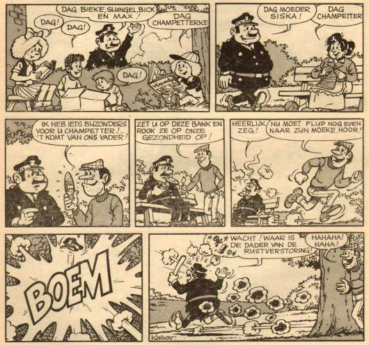 In 1976, Boumans also succeeded Hurey as the new artist of 't Kapoentje's flagship comic series 'De Lustige Kapoentjes' ("The Cheerful Rascals"), which had been a regular feature since 1947. The long-running gag comic revolved around a group of children pranking and counter pranking an obese police officer and a sneaky youngster. Like all his predecessors, Boumans kept both concept and characters, but with different names and designs. The new 'Kapoentjes' consisted of three boys, Max (wearing a cap), Slungel (with black curls) and Bick (with blond hair), as well as the blond-haired girl Bieke. The police officer remained nameless, but the villainous youngster was now named Flup. The name of the elderly Moeder Stans was changed to Moeder Siska. In 1978, Het Volk released the only book collection with Boumans' episodes of 'De Lustige Kapoentjes'. In 1985, Boumans retired and passed the series on to the mysterious artist "Jo", who continued it for three more years.