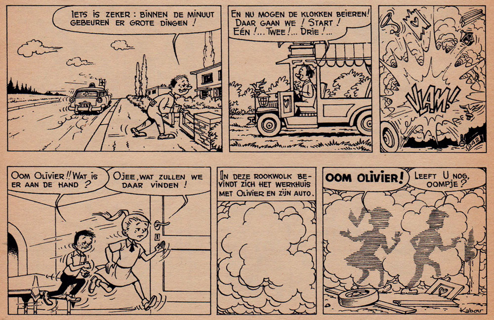 In the first issue of Strip, dated 1 September 1961, Kabou introduced the humor adventure series 'De Avonturen van Olivier', scripted by Karel Goderis. The series starred Olivier, a bald-headed uncle with a Chaplin mustache and his niece and nephew. The resemblance with Willy Vandersteen's 'Suske en Wiske' was hard to deny, in particular the dynamics between Olivier and the kids, which resembled that of Lambik with Suske and Wiske. Nevertheless, five stories were made, appearing in Ohee between 1965 and 1973. Goderis and Boumans also made 'Roel Harding' (1964-1966), of which three stories ran in Ohee!. 'De Hot Hitters' (1965), starring an aspiring pop band, was serialized in Strip in 1965, and ran in two issues of Ohee! in 1968. 'Bert Crak' (1967-1969), a humor comic about a failed handyman, was co-scripted by Goderis and Edwin Wouters. It subsequently appeared in four 1969-1970 issues of Ohee!.