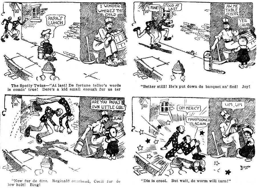 Arthur Laurence "Art" Bowen was born in 1881 in Sleepy Eye, Minnesota. His father was a newspaper publisher. Bowen studied at the Chicago Art Institute and in the early 1900s became a comic artist in the Chicago Daily News, where he replaced C.F. Batchelder's one-panel cartoon column. In the same paper, Bowen created his first comic strip, 'The Spotty Twins' (1905-1906), which took off on 18 January 1905. The Spotty Twins was a combination of a balloon comic and a text comic. While the characters used speech balloons in the panels, there was additional narration and dialogue written underneath each image. The main characters were two tall and thin twin brothers who both were bald and had a beard. They were tramps trying to find money or food and usually failing spectacularly. The influence of Frederick Burr Opper's 'Happy Hooligan' - the most famous comic strip about a hobo - is obvious.  Bowen's next comic series was 'Spotlight Steve in Vaudeville', which ran in Joseph Pulitzer's New York Evening World from 3 August 1911 until 6 July 1912. It stars a vaudeville artist often hit by bad luck. In 1912-1913, Bowen drew the short-lived comics 'Always Take Mother's Advice', 'Bub - He's Always to Blame' and 'What Happens to the Herrings?', distributed by the McClure Syndicate.