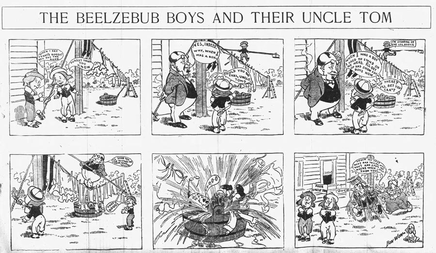 Bowen may have been the artist who made the newspaper comic 'The Beelzebub Boys and Uncle Tom' (22 June - 10 August 1902), under the pseudonym "Bow Bow". The gag comic features two boys who trick their uncle Tom in every gag, only for their mother to come in and help "poor Uncle Tom" out of his agony. In spirit, it was obviously inspired by Rudolph Dirks' 'The Katzenjammer Kids'. While Uncle Tom shares the same name as the African-American title character from Harriet Beecher Stowe's novel 'Uncle Tom's Cabin', all similarities end there.