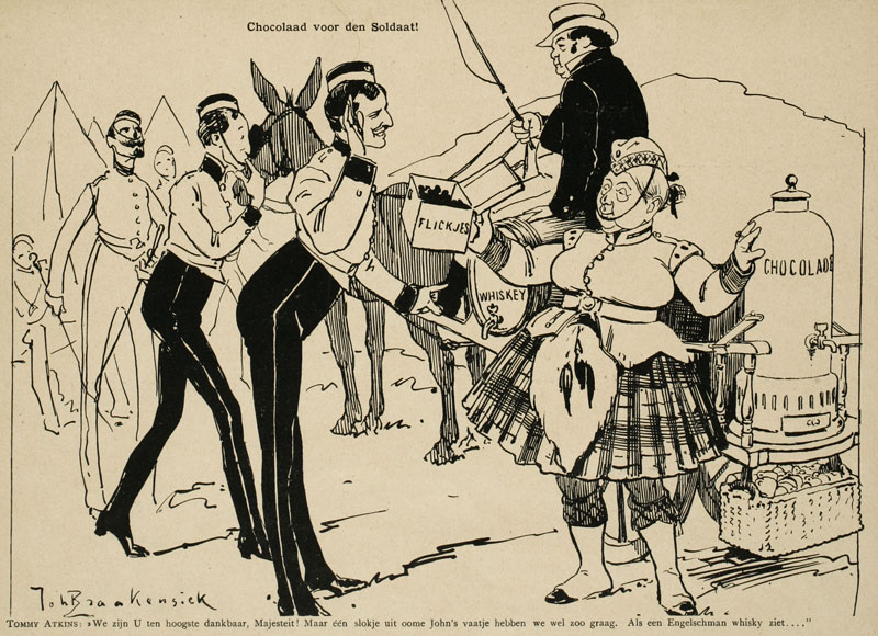 Cartoon depicting the British queen offering chocolate to her soldiers. Tommy Atkins (slang for a common soldier in the British Army) answers: "We are very grateful, your majesty! But we'd rather have one sip from uncle John's barrel. When a Brit sees whisky..."