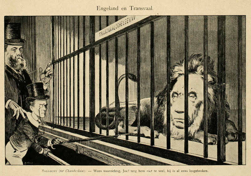 Cartoon satirizing England's battles against local Dutch colonists in the South African republic Transvaal during the Boer Wars (1899-1901). The bearded man in the hat is British Prime Minister Robert Gascoyne-Cecil, 3rd Marquess of Salisbury, who tells his child, Minister of Colonies Joseph Chamberlain, not to poke the lion (South African president Paul Kruger), because "he broke out of his cage before." In the end South Africa would indeed become independent.