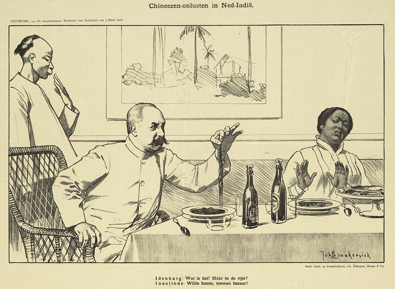 Cartoon from 1912. Portrayed is Governor-General of the Dutch East Indies (nowadays Indonesia) Alexander Willem Frederik Idenburg (1861-1935), who finds a Chinese braid in his rice. Idenburg says: "What is this? Hair in the rice?" Insulinde (a Dutch nickname for Indonesia) answers: "Wild hairs, toewan bezaar!" During Idenburg's reign (1909-1916) Chinese riots broke out in Batavia, Surabaya and Rembang, which had to be subdued by the military.