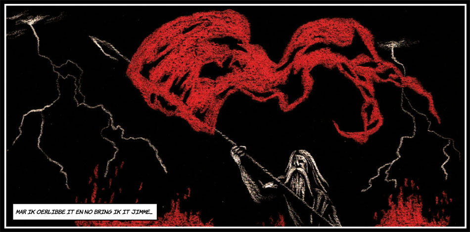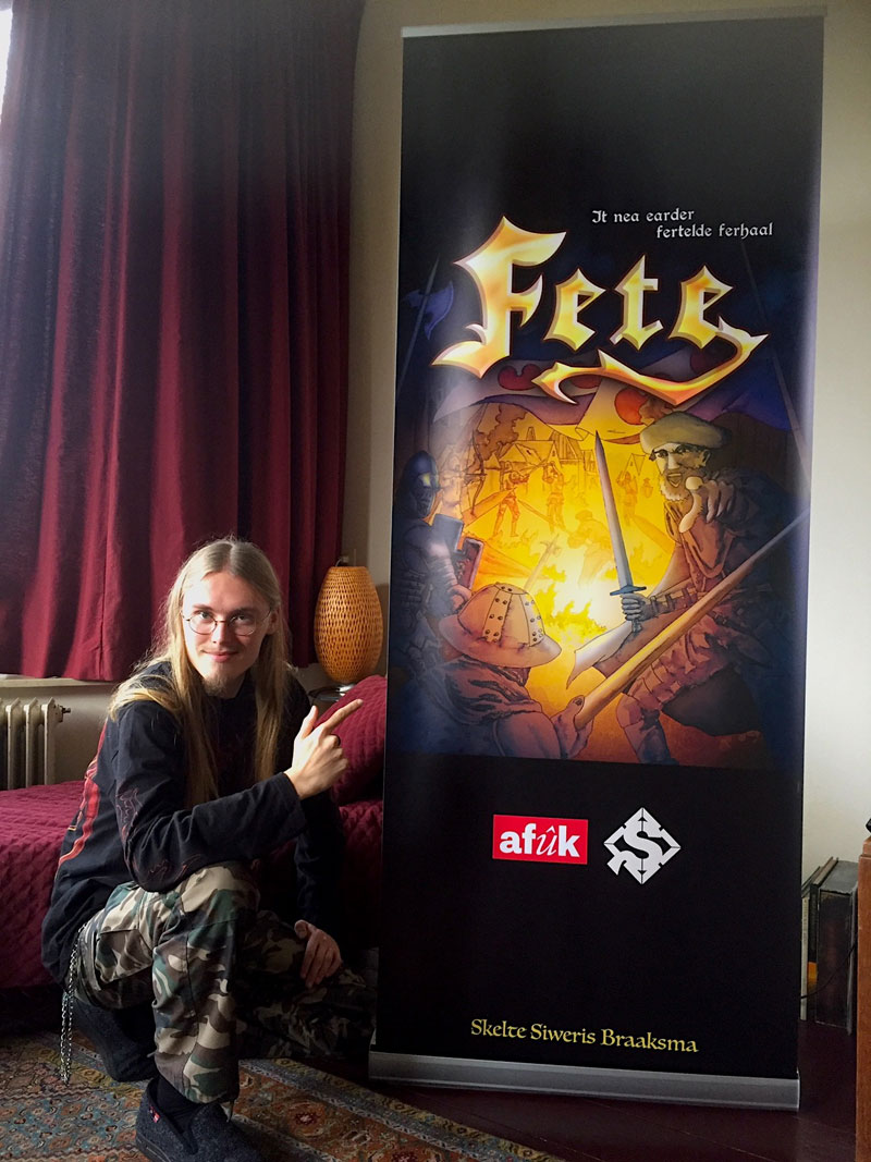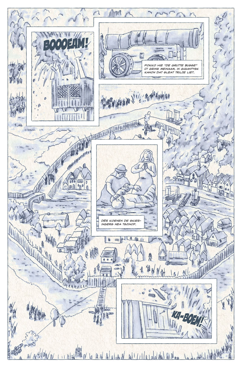 Stepping into the tradition of 'Kopkewoartel' (by Lieuwe Brolsma and Nico Oeloff), 'De Aventoeren fan Hotze Klots' (by Otto Gielstra and Aart Cornelissen) and comics by the Mudhoen collective, Skelte Braaksma is one of the few Dutch creators who makes comics exclusively in the Frisian language. Delving into the stories and history of his province, he has settled into a regional niche, making him one of the most prominent Frisian comic creators. To further boost comics in the Northern Dutch provinces, he initiated De Noorderlingen, a group of Frisian comic creators and other creative spirits who since 2018 support each other by making collective appearances on comic festivals and other events.