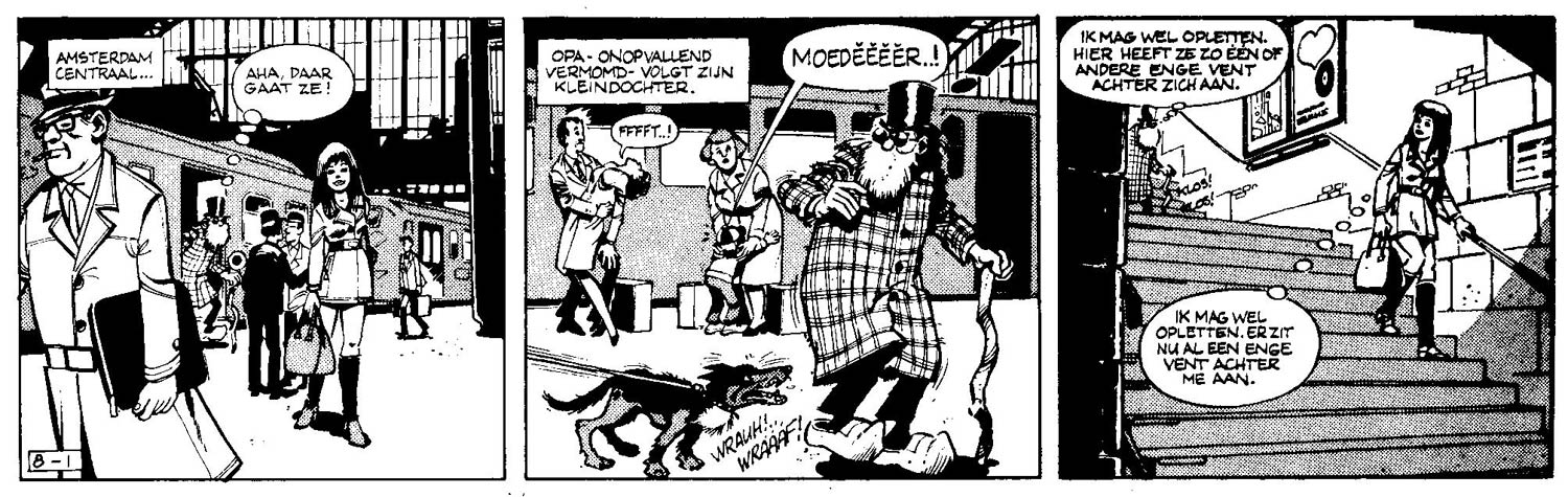 By 1971, De Telegraaf demanded something more light-hearted. Out were the unusual Horre, Harm and Hella, in came the cheeky girl Aafje Anders. Her adventures are set in the Dutch capital of Amsterdam, which makes them instantly recognizable. It also gave Brandt the chance to mix current-affairs into his stories. Aafje is however different from regular girls. Like her name suggests ("anders" means "different"), her solutions and methods are out-of-the-box, while her nature is rather recalcitrant. She seems to fall from one adventure into the other, but luckily her inventive grandfather is always nearby to help her out. Jan van Haasteren was the original artist of the feature, which began in De Telegraaf on 20 March 1971. He didn't feel at ease with the semi-realistic drawing style however, and was replaced by the Brit Robert Hamilton in the fifth story. Toonder staffer Richard Klokkers took care of the backgrounds in the Hamilton stories. The tenth and final adventure came to an end on 17 April 1973. Both 'Horre, Harm en Hella' and 'Aafje Anders' have been published in book format in the collection 'Uit de Toonder Studio's' by Arboris and Het Stripschap during the 1980s. An earlier book with the first 'Horre, Harm en Hella' stories was published by Tango in 1974.