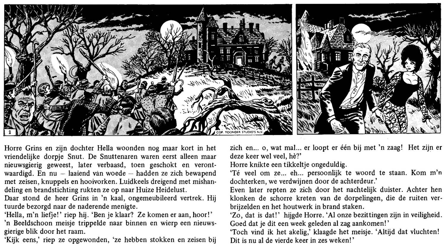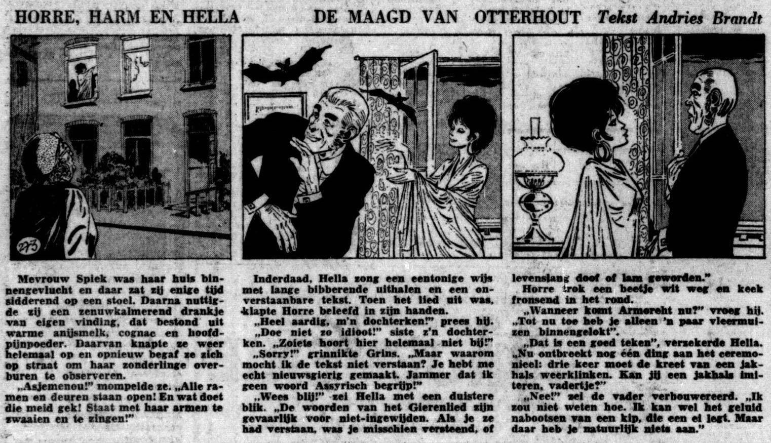 Brandt's main activities during the late 1960s and early 1970s were however the two newspaper strips he developed through the studios for newspaper De Telegraaf. The first of these was the text comic 'Horre, Harm en Hella' (1968-1971), which became the creation Brandt is most associated with. The strip stars the social outcast Horre Grim, his daughter Hella and their servant Harm. Their endeavors are within the realms of the mystic and the occult, which makes them regular targets of riots. The first story starts with villagers attacking their mansion with pitchforks, torches and sticks, which makes the family move once again. However, the highly awkward Horre just takes it all good-humouredly. The man doesn't regard himself as eccentric; his philosophy is that all other people are strange. The extraordinary comic strip began publication in De Telegraaf on 18 December 1968 and ran for eleven stories until 11 March 1971. The original artist was the Spaniard Juan Escandell, who was hired through a British agency (therefore the authors thought for many years they had worked with a Brit called "S. Candell"). He was replaced by Thé Tjong-Khing at the end of the first story. Jan van Haasteren joined Khing in the second story, and during the third adventure, Georges Mazure assumed the artwork. The initial concept was created by Brandt in cooperation with Klein, but the texts have remained a personal project for Brandt. Brandt remained the main plotter of the stories throughout the strip's run, but for the later stories Vera Wijman was brought in to write the captions.