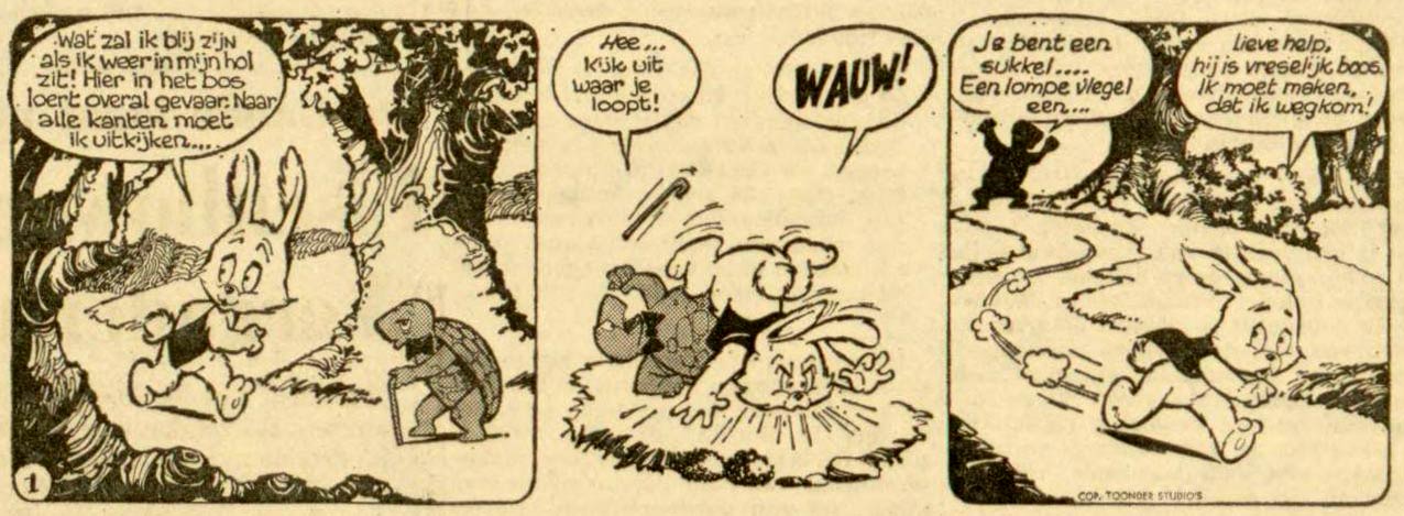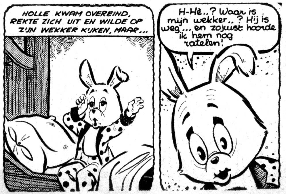Brandt's first major work for the studio was his own creation 'Holle Pinkel'. In the classic Toonder tradition, the main character was an anthropomorphic rabbit who has all kinds of adventures in an animal forest. However, 'Holle Pinkel' was a balloon comic, while Toonder's own series were text strips. Brandt initially wrote and penciled the feature himself, with Ank de Boer doing the inking duties. 'Holle Pinkel' ran in local and regional newspapers like Leeuwarder Courant and Provinciale Zeeuwse Courant from 15 September 1960 until 11 June 1963. During the eleventh story, Piet Wijn took over the artwork. Wijn drew five more stories from scripts by Brandt, and in 1963-1964 subsequently made a full color page for the Christian weekly De Spiegel all by himself.