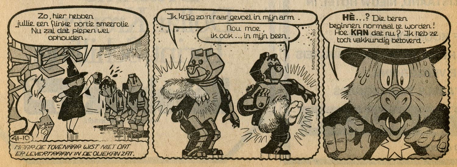 Brandt additionally wrote a couple of stories for the 'Tom Poes' balloon comic, which ran in Donald Duck. 'De Tegendeler' (1967) and 'De Rappe Raters' (1968) are known to be his, and he has also further developed Patty Klein's test assignment 'De Woelwater' (1967). Later on, Brandt and Klein plotted 'Tom Poes en de Wiekschieters' (1970), which appeared as a promotional comic for Alete-Molenaar infant nutrition. With artist Jan van Haasteren, they created 'Bartje en Opa' for free local papers from Amsterdam (1967-1970) and The Hague (1970-1971). Klein and Van Haasteren later continued the comic without Brandt for the children's magazine Jippo under the title 'Erik en Opa' (1974-1980). During the final years of the comics department, the Toonder Studios received orders from foreign publishers as well. This resulted in Brandt and Klein plotting stories with Rolf Kauka's 'Fix und Foxi', 'Pauli' and 'Die Pichelsteiner' for Fix und Foxi magazine from Germany, and also many gags with the anthropomorphic cat 'Pelle Svanslös' (a creation of Gösta Knutsson) for Semic Press in Sweden. The team also came up with new series which stranded in the development phase, such as 'Toef de Tiller' (with Jan van Haasteren), 'De Wensvervuller' (Piet Wijn), 'Engel en Duivel' (Piet Wijn), 'Otje Otter' (Jan van Haasteren) and 'Wriemelburg' (Leo van Noppen).