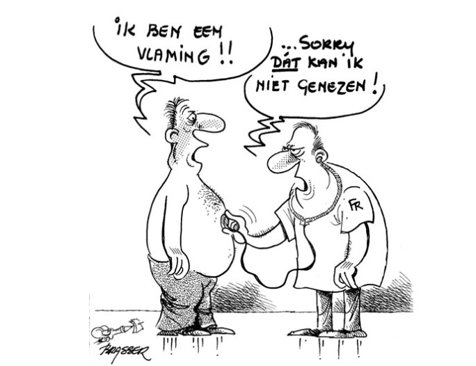 Cartoon by Brasser. Translation: "I'm a Fleming." - Doctor: "I'm sorry, I can't cure that."