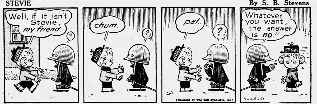 Stevens subsequently made a gag-a-day comic named 'Stevie' (1951-1952), again about a little boy dressed up as an adult. Most of the time he wore a soldier's helmet and carried a wooden sword around, much like 'General Mischief'. The comic appeared in Judge and was syndicated through the Bell Syndicate between 2 April 1951 and 1 May 1952. 'Stevie' gags were additionally reprinted in early 1950s comic books by National Comics (the current DC Comics), such as 'A Date With Judy', 'Buzzy', 'Here's Howie Comics' and 'Leave It To Binky'.
