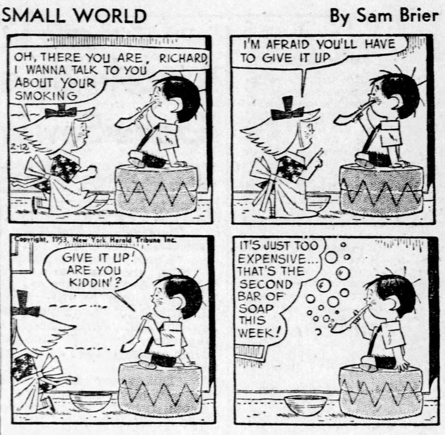 In an article about 'Small World', published in The Indianapolis News on 3 July 1954, Brier gave insight why he was so interested in child characters as protagonists for his comics and cartoons:  "When children play house, they mimic their elders with an innocent wit that goes right to the heart of the matter. They're the best comedians since the silent movies."