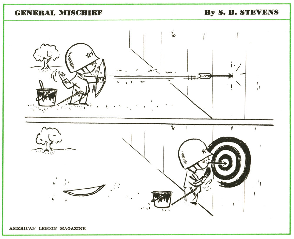 Another regular strip/cartoon feature by Brier was 'General Mischief' (1947-1949), which he signed with his real name. Much like 'Mop O'Hare', it featured children as protagonists, in this case a boy imagining himself to be a US general. 'General Mischief' ran in The American Legion Magazine, the house organ of the U.S. war veterans' organization. 'General Mischief' was later syndicated to newspapers by the McNaught Syndicate. Brier later re-used the concept of children acting like adults for his longer-running gag comic 'Small World' (1952-1956).