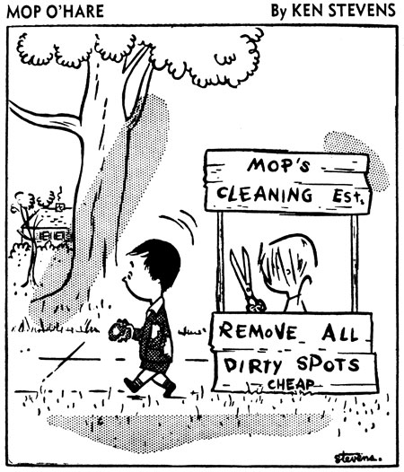 Between 30 July 1945 and 25 January 1947, Stevens drew the one-panel cartoon series 'Mop O' Hare' (1945-1947) for the New York Post Syndicate. The title character was a young bratty boy, whose hair always hangs over his face. Non-English speakers might not spot the pun hidden in his name ("mop o(f) hair"). While the gag cartoon only ran for two years, it was the first of many cartoon features by Stevens about children. However, he signed 'Mop O'Hare' under the pseudonym "Ken Stevens".
