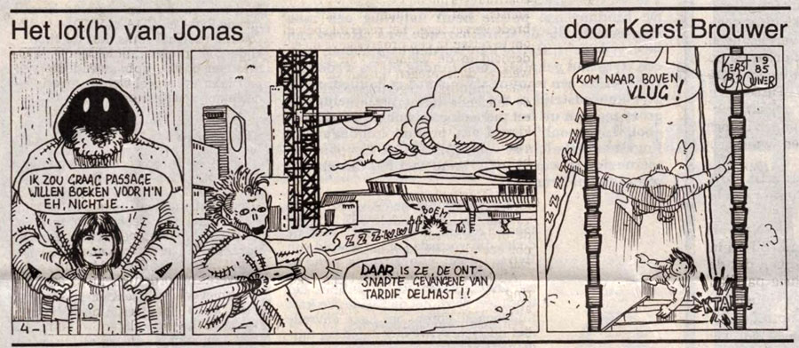 From 31 May through 29 June 1985, Brouwer's humorous sci-fi comic strip 'Het Lot(h) van Jonas' ran in the Communist newspaper De Waarheid. Brouwer was part of a new generation of artists which filled the paper's comics section in 1985, and he appeared alongside 'Loenies' and 'Tater de Kater' by Ernst van Veenendaal, and 'Los Cocos' by an artist known only as René. Earlier that year, the paper had published strips by Herwin Walravens, Marc de Boer, Gerrit Geitenoog, Remco de Korte and Tosti, mostly (former) contributors to the amateur comic magazines Rats, TNT and Baal. Brouwer's feature was remarkable because it was the only serial among gag strips. The paper's comic section seems to have been a tryout for amateur cartoonists, and most them quickly disappeared from the comics radar. Brouwer's further whereabouts are unknown.