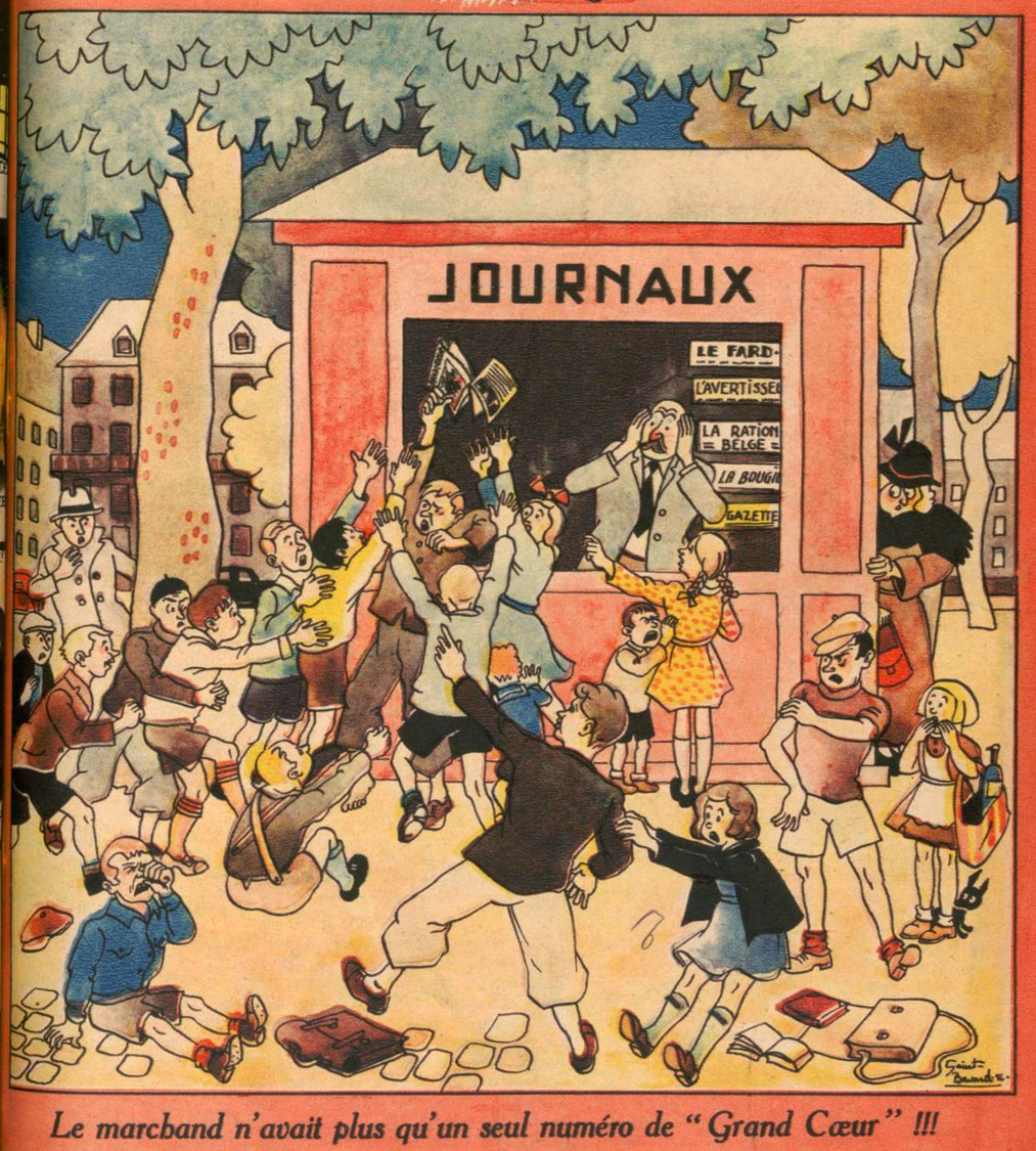 Between 1945 and 1946, Brouyaux appeared prominently in Grand Coeur, a short-lived comic magazine from Liège, created by the cartoonist Charles Gilbert and Étienne Lamarche, publisher of the newspaper La Gazette de Liège. Throughout most of the magazine's run, he contributed a great many pantomime gag strips, most of them starring the weird and unfortunate everyday escapades of 'Monsieur Zizifus', AKA 'Le Professeur'. In addition, he contributed gag strips without recurring characters, often showing people ending up in silly situations because they are too busy reading Grand Coeur. After a while, he changed from signing with "F. Brouyaux" to using the pen name "Saint-Bavard". On occasion, Grand Coeur ran similar gag strips signed with "A. Toussaint", but this seems to be another artist.