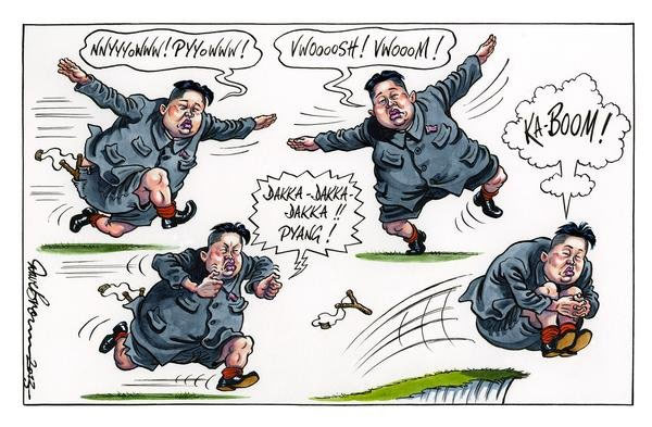 Cartoon mocking North Korean dictator Kim Jong-Un and his megalomaniac war plans, The Independent, 12 April 2013.