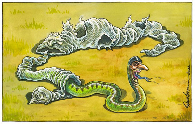 Cartoon, The Independent, 25 October 2022. Dave Brown's submission for the 2022 Cartoon of the Year Award. It shows the British Conservative Party in their "annus horribilis" 2022, as a snake shedding its skin, after Prime Ministers Boris Johnson and Liz Truss abdicated and Rishi Sunak succeeded them, all in a matter of months.