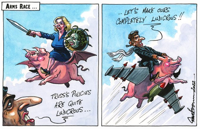 Cartoon depicting British Conservative Party members Liz Truss (holding Margaret Thatcher's face as the head of Medusa) and Rishi Sunak, who'd succeed each other as Prime Minister in the fall of 2022, The Independent, 3 August 2022.