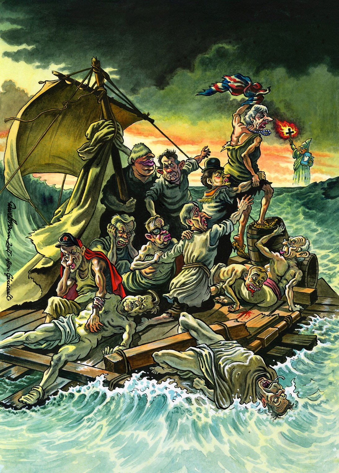 'The Raft of Brexit' (2018), parody of Theodore Géricault's painting 'The Raft of the Medusa', featuring British politicians trying to steer the U.K. after the country left the European Union in 2016. Boris Johnson holds the mast, while Theresa May waves the flag to U.S. President Donald Trump at the horizon, portrayed as a mock version of the Statue of Liberty, holding a Ku Klux Klan torch and a Twitter book.