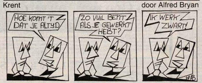 'Krent', in De Waarheid (26 February 1985). Translation: "How come you're always so dirty after you've worked?" - "I do undeclared work." (A pun on "zwart werken", literally translated "working in black.")