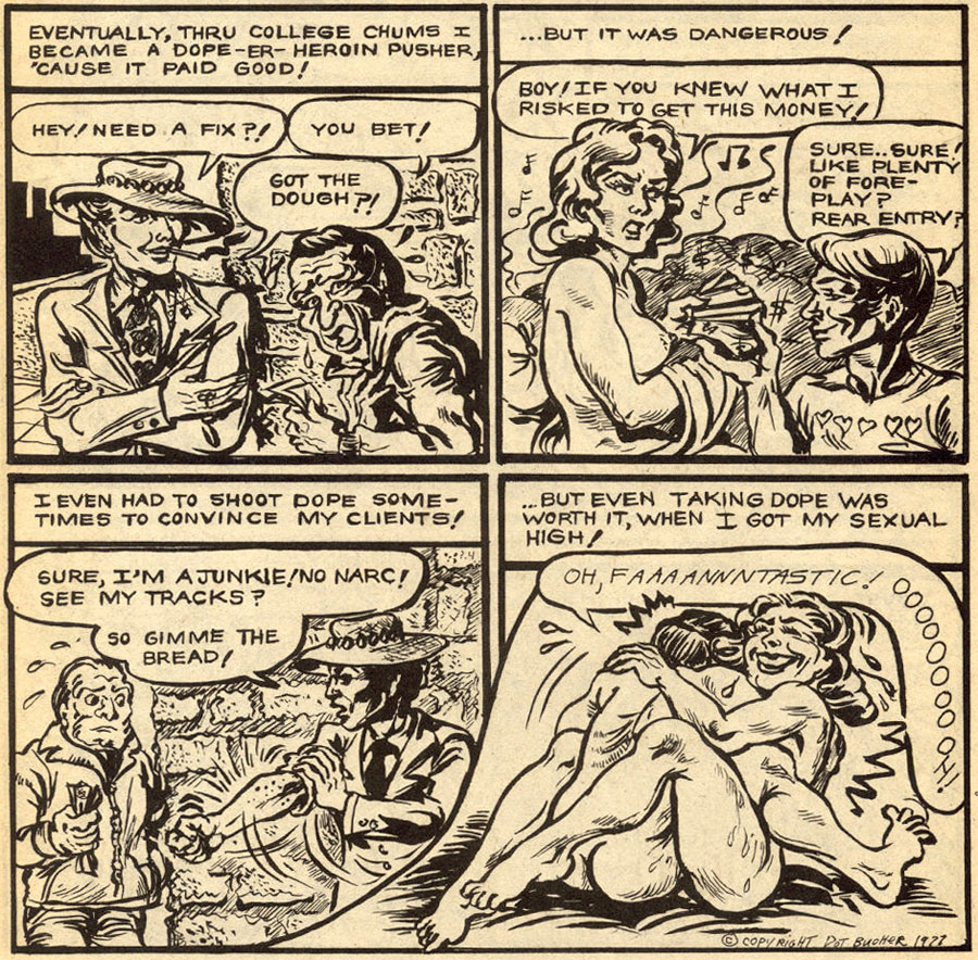 Between 1972 and 1976, Dot Bucher contributed to Tits and Clits Comix (Nanny Goat Productions, later distributed by Last Gasp), the all-female underground comix book title launched by Lyn Chevli and Joyce Farmer. Her story 'I Was a Sex Junkie!' appeared in issue #3 (February 1977), spoofing educational propaganda media. The title character exposes her life as a nymphomaniac, but eventually gives up her vice to find a better addiction: drugs! The satirical story was praised by journalist and fellow artist Clay Geerdes, who named Bucher “a genius”. The fourth issue (December 1977) featured Bucher's memorable parody of the TV show 'The Bionic Woman', titled 'The Bosomic Woman', in which a colossal-breasted woman fights crime and injustice. She made a follow-up story using the same character in issue #5 (July 1979), titled 'Bosomic Woman meets the Hunk'.