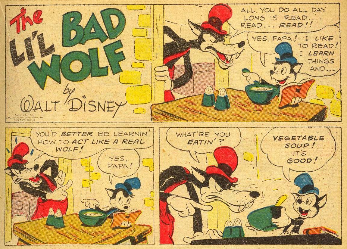 In the 'Silly Symphonies' Sunday newspaper comics, writer Ted Osborne and artist Al Taliaferro followed the cartoon universe of the Big Bad Wolf quite faithfully. For the Dell comic books, scriptwriter Chase Craig created a new set-up with more family dynamics. The three sons from the 1936 cartoon were reduced to just one. In addition, his personality was changed considerably from his animated precursors. Unlike his name, Li'l Bad Wolf is far more honest, friendly and intelligent than his father. A shame to the Wolf family, he is best friends with the three pigs, and doesn't want to harm them, but instead help them against his father's antics. Much to his father's annoyance, he is also a vegetarian.