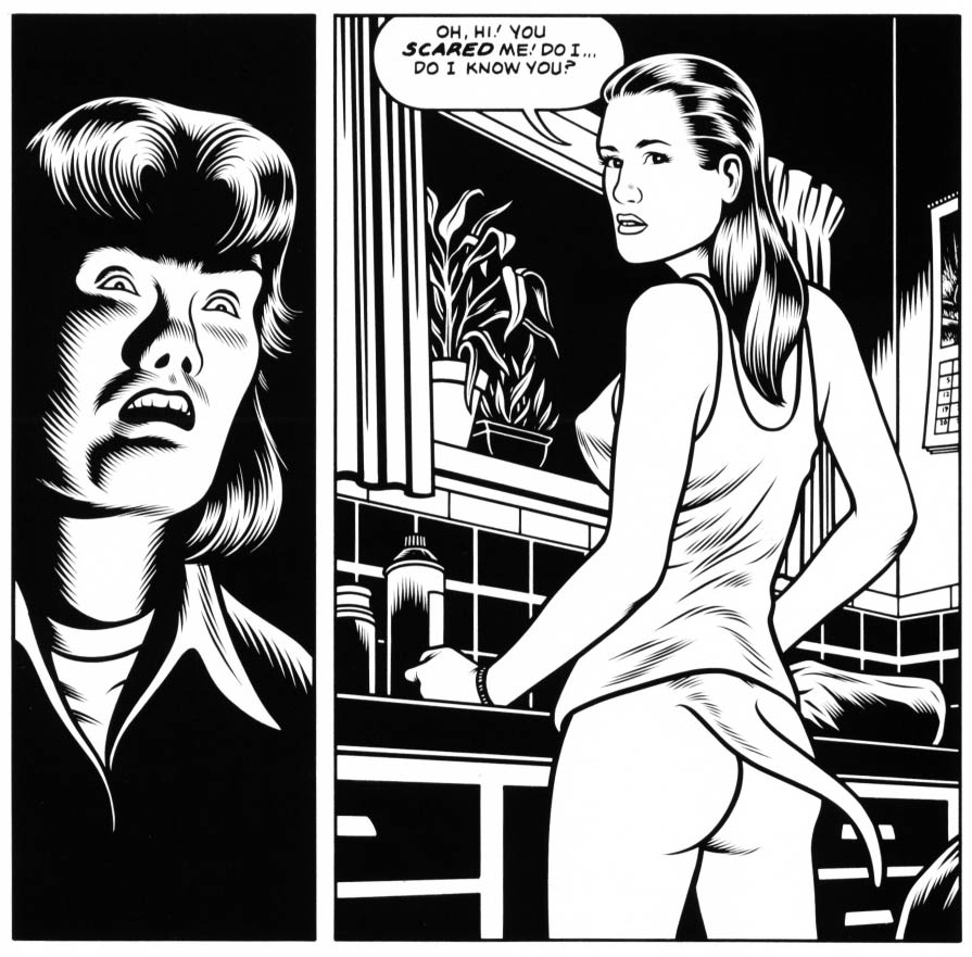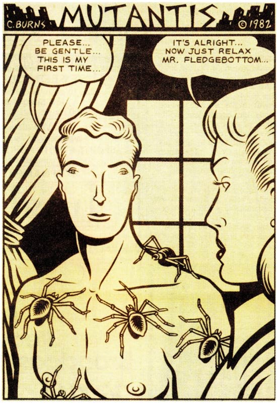 Burns found his niche in the 1980s, drawing horror comics with a retro-1950s feel. The stories either take place in seemingly "normal" white suburban American neighborhoods or use stock clichés found in comic books from that era: pipe-smoking husbands, docile housewives, innocent little boys, rebellious teenagers, mad scientists, hard-boiled detectives, and grotesque monsters. His drawings look like any slick mass-produced product from that time period, yet this mundane atmosphere is twisted into something far more horrific and uncomfortable. The characters in his comics have something otherworldly about them, even the people who aren't revealed to be monsters. This unnerving effect is achieved partly by Burns' art style. As Lynda Barry once wrote: "You can't believe a person could do it with regular human hands. It's the kind of drawing that would have scared the pants off you in grade school, not only because the images are so eerie but because they are too perfectly done, and not good or evil enough for you to tell what you are supposed to think about them." Burns often gets his inspiration from a visualized image, and builds his plots from there. To him, stories also function on an unconscious level, and reveal more hidden truths to the audience in the end. Many of his comics feel like a fever nightmare. Underlying themes of alienation, peer pressure, puberty angst and sexual anxieties slither throughout the tales.
