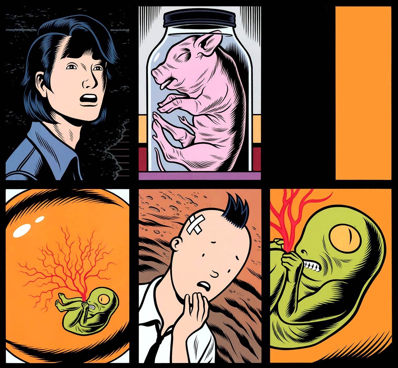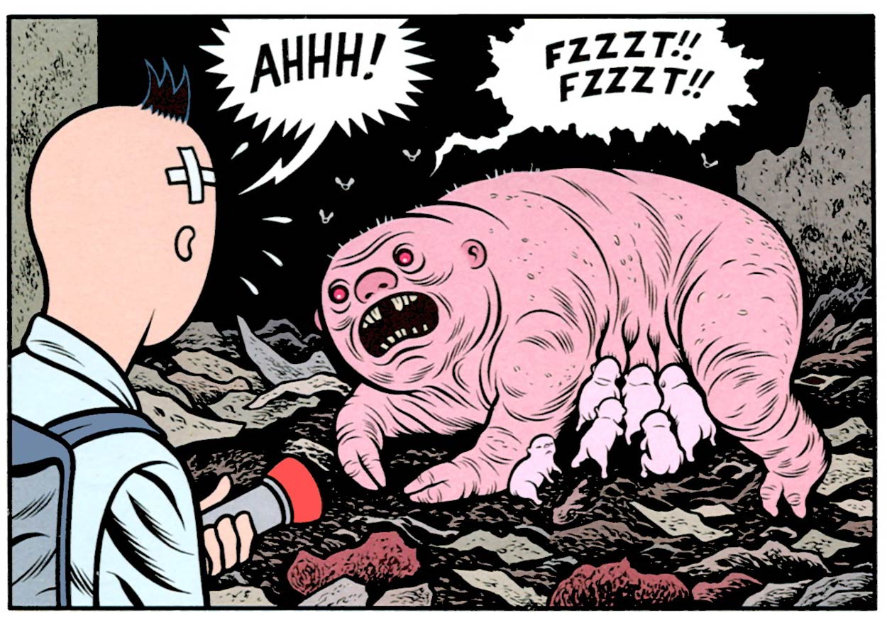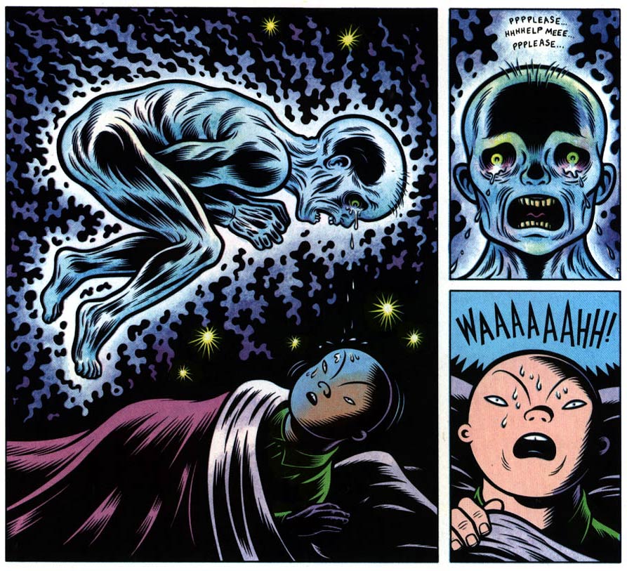 Charles Burns' first series was 'Big Baby', which debuted in RAW in 1982. The “Big Baby” in the title is actually just Tony Delmonto, a teenager with a baby face and a large bald head. He lives in an American suburb and enjoys typical children's activities, such as playing with toys in his room and going on a summer camp. He is a young, impressionable boy who gets immersed in reading comics and watching horror movies. However, in this seemingly safe environment, darker monstrosities lurk in the shadows. In 'Teen Plague' (1989), Tony is sent to bed early by his babysitter, because she expects a visit from her boyfriend. As he reads his horror comic about extraterrestrial alien infections, he becomes convinced that the teenagers in his life suffer from some icky "teen plague". In 'Curse of the Molemen' (1982), Tony is intrigued by a swimming pool dug by his neighbors. In 'Blood Club' (1992), the boy witnesses the ghost of a dead child at his summer camp. 'Big Baby' was collected in book format by Kitchen Sink Press and in 1999 published into one volume by Fantagraphics.