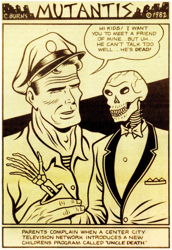 Burns also tried his hand at weekly comics. In 1982, he made 'Mutantis', a series of black comedy one-panel cartoons for the Seattle magazine The Rocket. Early parts of one of his stories, 'Burn Again' (1989), appeared in his serialized ‘Big Baby’ strip. Some religious groups complained about its plot line, featuring people with blisters in the shape of Jesus' face and a God-like creature with one eye, and the serial was discontinued before completion. As a result, readers had to wait for the conclusion of the story until it was published in the Burns collection ’Skin Deep’ (Penguin Books, 1992).